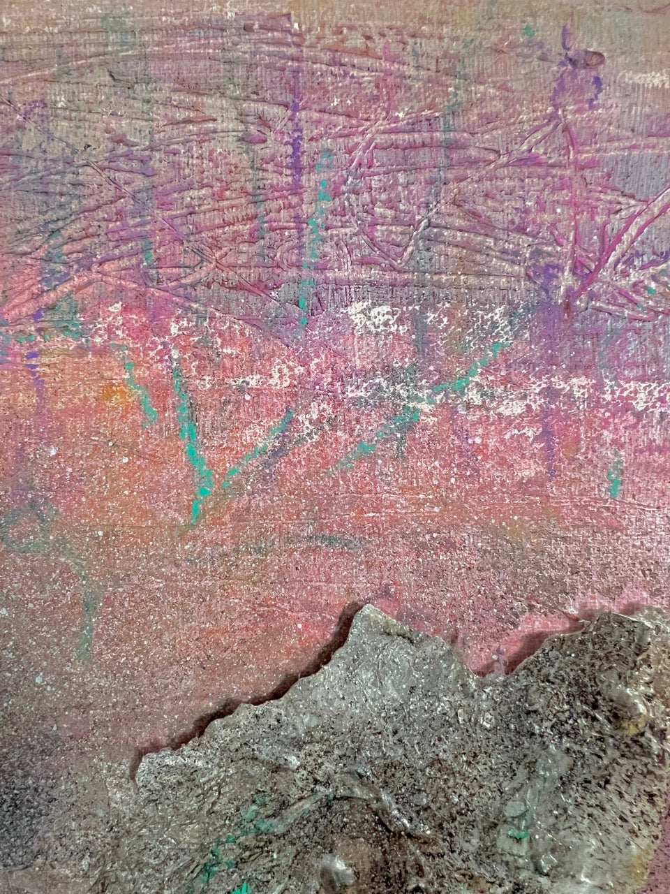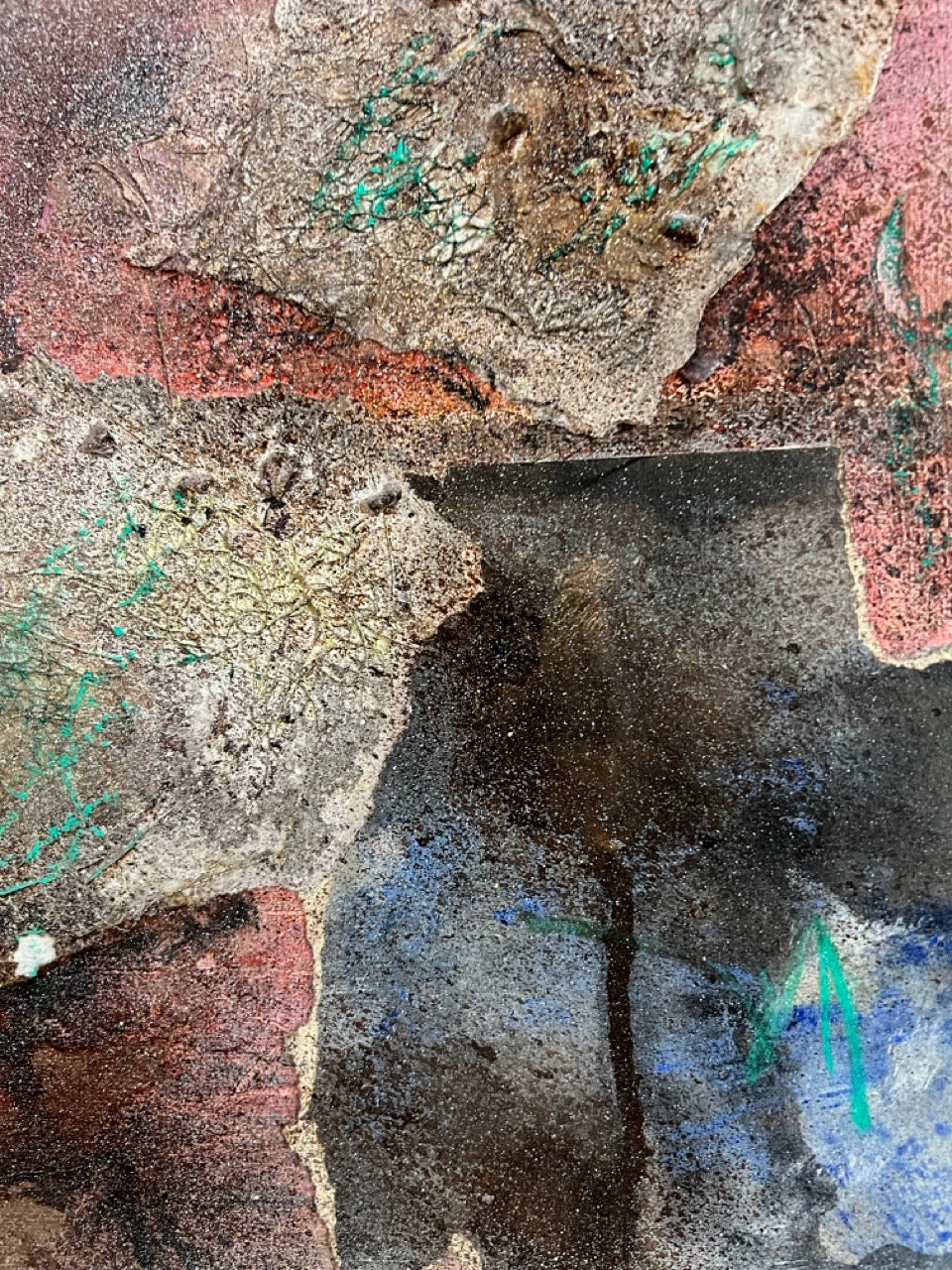 Autumn in Paris is a piece that carries layers – layers of materials, time, and stories. Its surface is alive, rich with texture and detail, born from combining fragments of artists previous works into a new whole. It is a fusion of collage and painting, where history and the present meet to form a uniquely layered landscape.