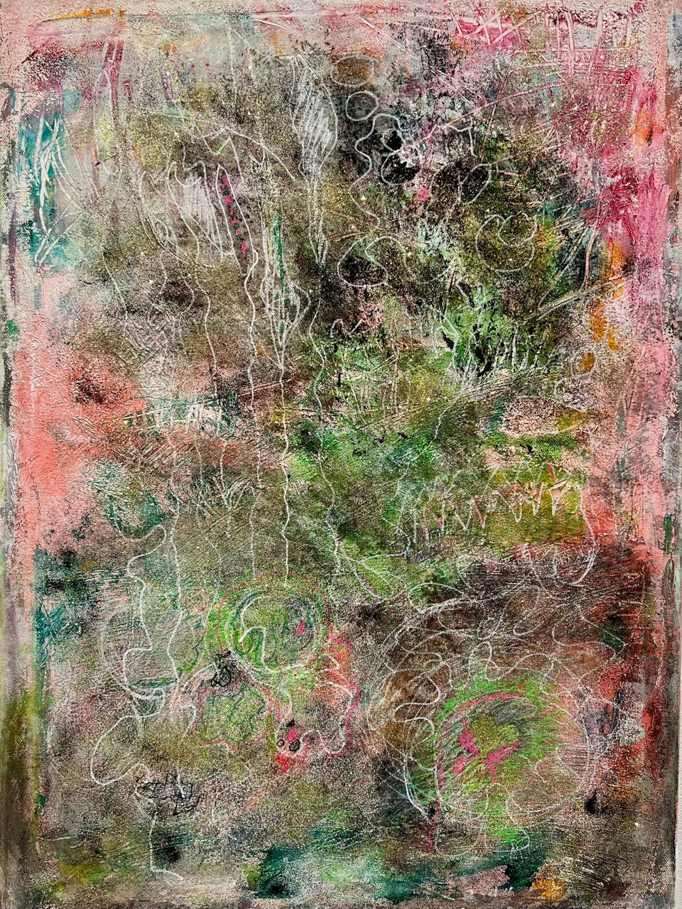 Viisauden alku on matka syvälle intuition, luonnon ja tiedostamattoman rajapintaan. Teos rakentuu monikerroksisista, orgaanisesti elävistä pinnoista, joissa vihreän ja maanläheisten sävyjen lomassa pilkahtelee vaaleanpunaista, valkoista ja syvempiä, varjoisampia sävyjä. Viivat, kuin muistojen jäljet, hahmottavat hahmoja ja symboleita – ne eivät ole täysin näkyviä, mutta ne tuntuvat.