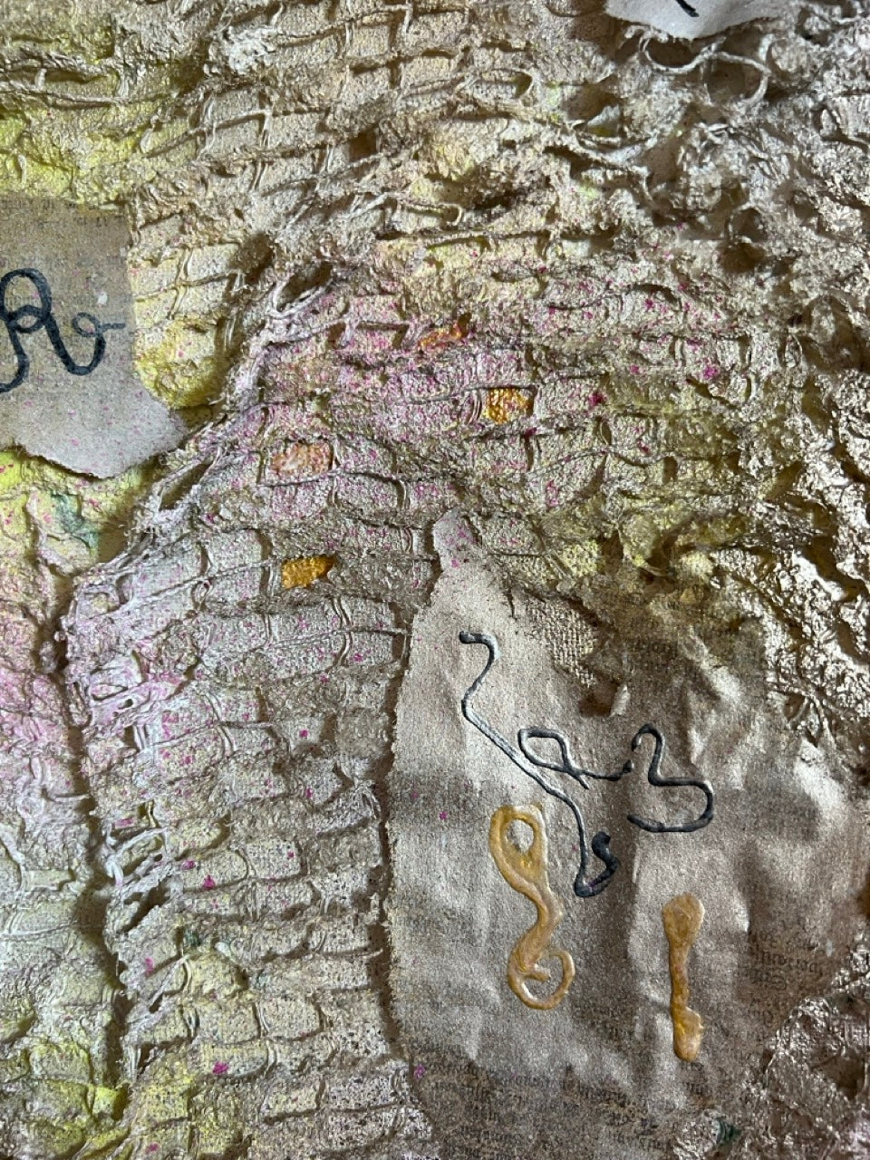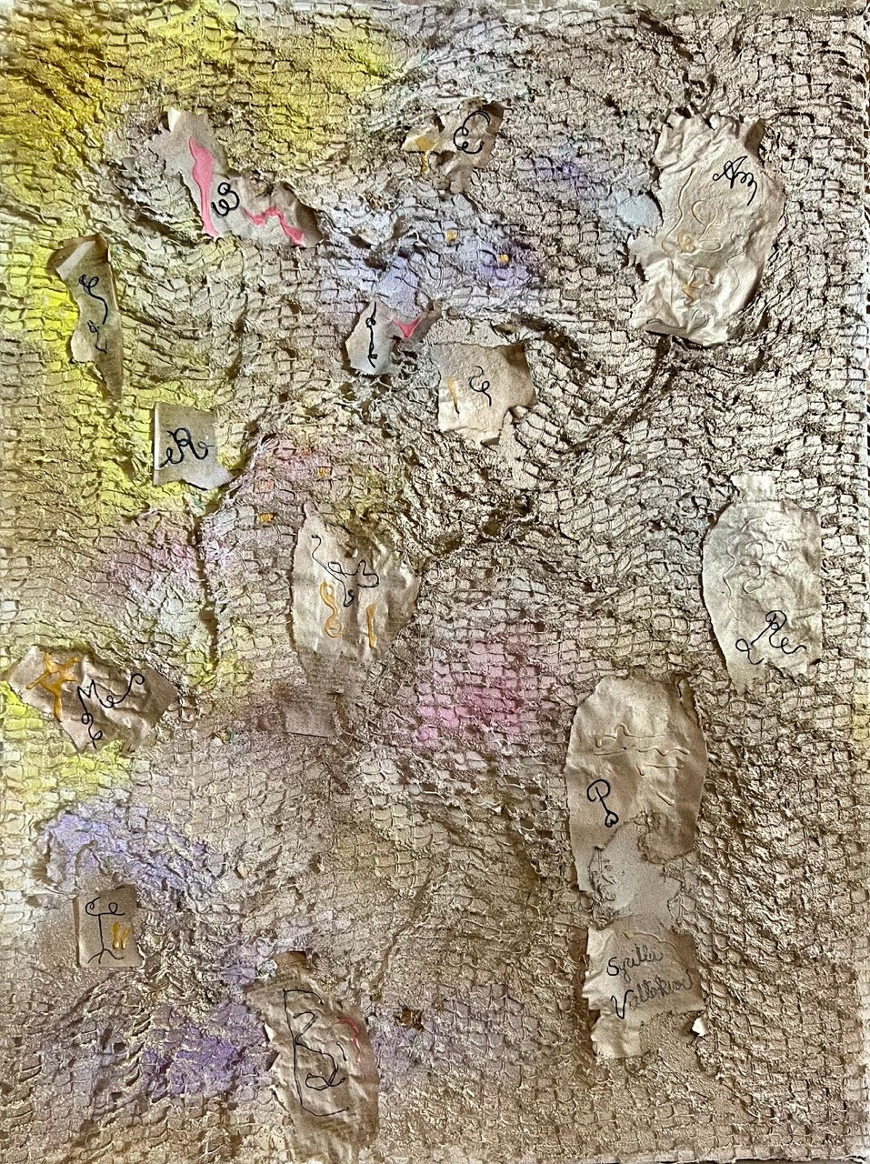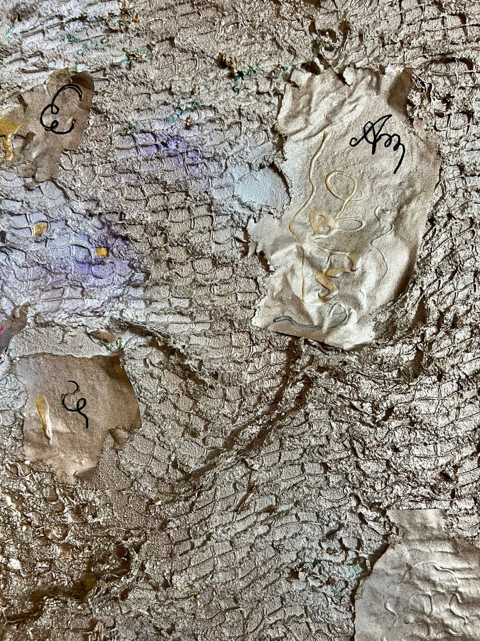 Tämä vangitseva monitekniikkatyö yhdistää maalauksen, kankaan ja paperin ainutlaatuiseksi kokonaisuudeksi canvas-pohjalla. Teoksen tekstuuri, metallinhohtoiset sävyt, pehmeät pastellivärit ja yksityiskohtainen kirjainkuviointi muodostavat visuaalisen matkan, joka kuvastaa elämän kerroksellisuutta ja kauneutta. Jokainen kirjain ja materiaalin pala kertoo tarinaa, kutsuen katsojaa löytämään teoksesta omat merkityksensä.