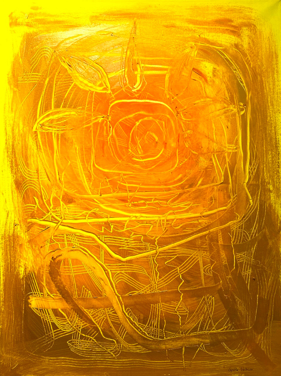 Teoksen kerroksellinen tekstuuri ja kaarevat viivat tuovat mieleen auringonsäteet, jotka kietoutuvat ympäristöönsä. Viivat tuntuvat heijastelevan sekä liikettä että juurtumista, kuin elämä itse – jatkuvasti muuttuva mutta samalla syvälle olemassaoloon ankkuroituva. Tämä on hetki ennen kuin aurinko uppoaa horisonttiin tai nousee uudelle päivälle, hetki, jossa aika tuntuu pysähtyvän.