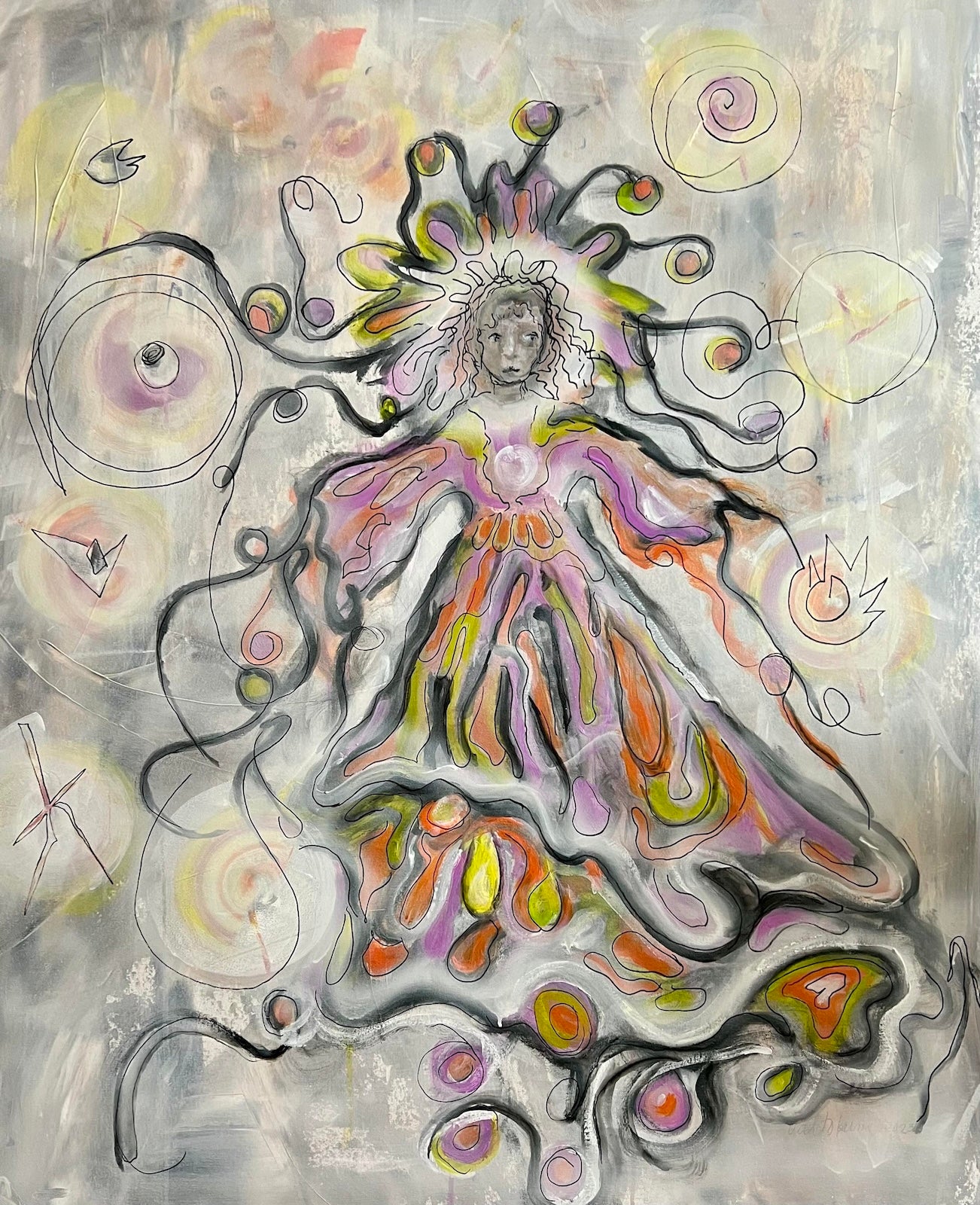The soft, ethereal background leaves space for the brighter hues that live in her flowing garments and the energetic lines weaving around her. Shades of orange, violet, and green pulse with life, while also reminding us that each of us carries invisible threads tying us to generations past. Lines and spirals guide the eye forward—to the threshold where life and death meet, where memories live on eternally.